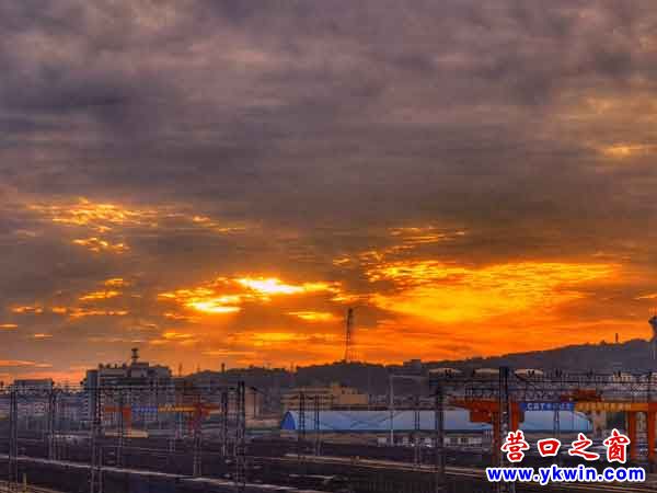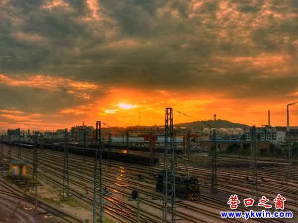 2020年6月22日傍晚,浮云飛渡,夕陽西下。7點(diǎn)左右,西部天空的云縫中漸漸透出了一絲又一絲金黃色的光芒,隨之,光芒越來越大,光線越來越強(qiáng),光澤越來越紅。一時(shí),光芒依附著光澤,光亮襯托著彩云,終于演變成為半天絢麗多彩、紅光四射的晚霞。將位于墩臺(tái)山下、緊鄰營(yíng)口港的鲅魚圈火車站映襯的夜色斑斕、壯麗輝煌。