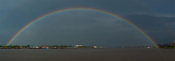 黑云密布,驟雨突降,讓你來不及躲避便傾瀉如注……轉瞬間云縫透射出陽光,忽然一道如橋的彩虹橫跨遼河南北兩岸,海鷗伴彩虹上下翻飛,像似為這壯美的濱城歡歌起舞,此景蔚為壯觀。