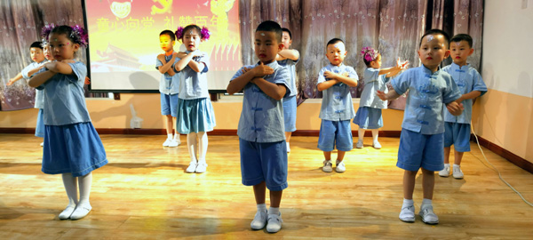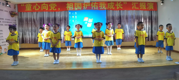 演出于下午三點(diǎn)開始。四十多名小朋友和四十多位家長(zhǎng)歡聚一堂,歡歌笑語(yǔ),掌聲時(shí)起。吟誦傳統(tǒng)國(guó)學(xué)童聲朗朗,韻味十足。朗誦毛澤東詩(shī)詞語(yǔ)句鏗鏘有力,情感豐富。張張笑臉,如花兒般燦爛可愛,聲聲演唱,如銀鈴般甜美動(dòng)聽。舞動(dòng)翩翩,如同美麗的蝴蝶在舞臺(tái)上飛舞,舉手投足,活潑可愛。童心向黨,天真爛漫。十幾個(gè)小節(jié)目,表演下來(lái)令我們?nèi)缱砣绨V,感動(dòng)不已。