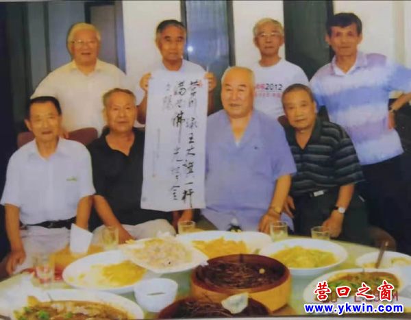 2013年夏天囬營,我特意為送別老孟大哥功成名就榮退乒臺開了一桌老友宴。還和璽武精心考慮,書寫一條幅:“營川球王,大旗一桿;滿面佛光,熔金夕陽。”以表我們由衷的敬贊!大家在歡樂中拍照留念。這張精心收藏的營口老球友彩照,我還時常拿出來看看,回憶著那往昔活躍的、暢懷的、幸福的乒乓歲月!