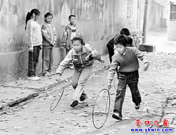 有時(shí)用鐵鉤跑著推“轱轆圈”……