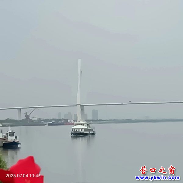 仲夏有余日,暢旅大遼川。墜龍?zhí)J蕩,距今營口問何年。南塢登輪新渡,北岸尋查古跡,夢想已蹁躚。神話變橋越,橫亙面潮懸。