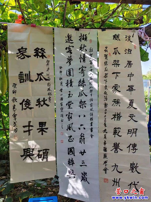 注:絲瓜架下詩(shī)畫(huà)會(huì)是營(yíng)口市老邊區(qū)人大退休干部張玉復(fù)老先生發(fā)起,邀請(qǐng)?jiān)娪押图易迦藛T參加的聚會(huì),創(chuàng)辦于2000年,因其家院中有架絲瓜而得名。