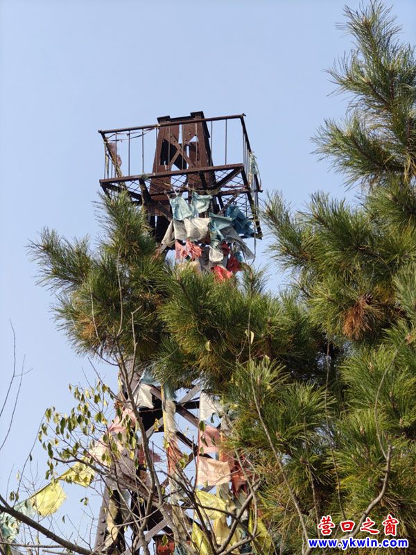 當(dāng)我攀上這座峰頂?shù)臅r(shí)后,映入眼簾的東方的港口和腳下的城區(qū)。雖然它們被薄霧籠罩著,但我感到它們正在從四面八方簇?fù)碇?,而我也要擁抱著這至高點(diǎn),一座斑斑鐵銹,掛滿殘破小旗的鐵塔。這些小旗實(shí)則就是經(jīng)幡,我在很多藏族寺院中見過,它像征了神的福祉,在隨風(fēng)飄蕩中給人們帶來吉祥,我頓時(shí)覺得腳下的這座山有了仙氣。