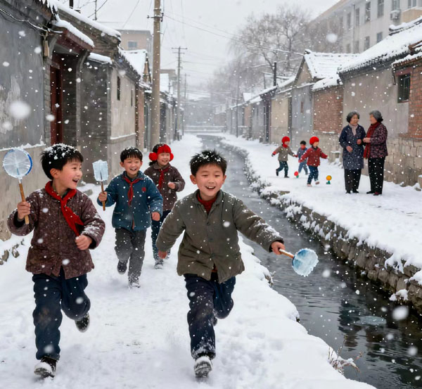 我小時(shí)候冬天的營口更有意思。雪一落,胡同里滿是孩子的歡叫,“走啊,打冰嘎去!”“咱去河沿兒打出溜滑!”冰嘎就是陀螺,轉(zhuǎn)起來的嗡嗡聲,混著孩子們的笑聲,能把寒冬都烘得暖起來。要是倆小子起了爭執(zhí),一個(gè)瞪著眼說“你瞅啥”,另一個(gè)梗著脖子回“瞅你咋地”,聽著像要吵架,可轉(zhuǎn)眼又跑一塊了玩兒去了——那點(diǎn)小挑釁里,全是營口孩子的直爽,沒那么多拐彎抹角的心思。
