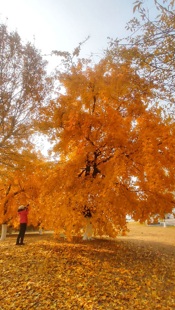走進(jìn)明湖廣場(chǎng),映入眼簾的是那一排排高大的五角楓,它們像是被大自然這位神奇的畫師打翻了調(diào)色盤,葉片從原本的綠色變成了絢麗的紅色和金黃色。每一片楓葉都像是一團(tuán)燃燒的火焰,在陽(yáng)光的照耀下閃爍著迷人的光芒。微風(fēng)吹過(guò),楓葉沙沙作響,仿佛在訴說(shuō)著秋天的故事。 陽(yáng)光透過(guò)樹(shù)葉的縫隙灑下來(lái),地上便布滿了星星點(diǎn)點(diǎn)的光斑,宛如一幅金色的地毯。偶爾有幾片楓葉飄落,它們?cè)诳罩写蛑齼海袷且恢恢霍骠嫫鹞璧暮?,輕輕地落在地上,把大地鋪成一片金黃。