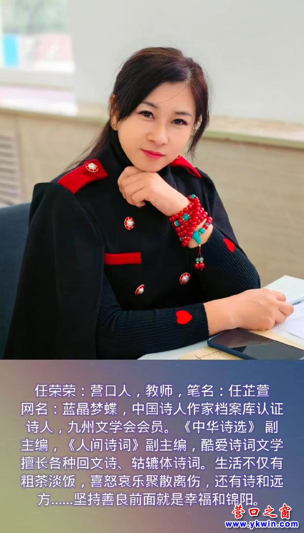 作者簡介:任榮榮,營口人、教師,筆名:任芷萱,網(wǎng)名:藍(lán)晶夢(mèng)蝶,中國詩人作家檔案庫認(rèn)證詩人,九州文學(xué)會(huì)會(huì)員?!吨腥A詩選》 副主編,《人間詩詞》副主編,酷愛詩詞文學(xué)。擅長各種回文詩。生活不僅有粗茶淡飯,喜怒哀樂,聚散離傷,還有詩和遠(yuǎn)方……堅(jiān)持善良,前面就是幸福和錦陽。