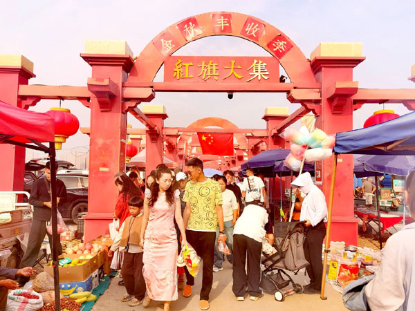 紅旗大集盛名揚(yáng),遠(yuǎn)客紛來(lái)聚四方。