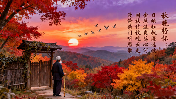 層林盡染映余暉,霜降楓紅雁欲飛。
