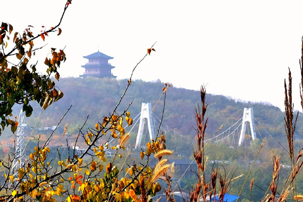 時至深秋,天晴氣朗,云淡風(fēng)輕。正是海濱城市鲅魚圈風(fēng)光最美的時節(jié)。青龍山公園,幾經(jīng)風(fēng)霜的洗禮,已經(jīng)變成了一座絢麗多彩的五色花山。你看那青松蒼翠,銀杏金黃,楓樹火紅,柳樹翠綠。觀景塔巍然屹立,高聳入云;懸索大橋靜靜橫臥,勢若長虹;文化長廊古香古色,雕梁畫棟;大門牌坊歷史厚重,大氣恢宏。好一幅壯美的深秋畫卷。