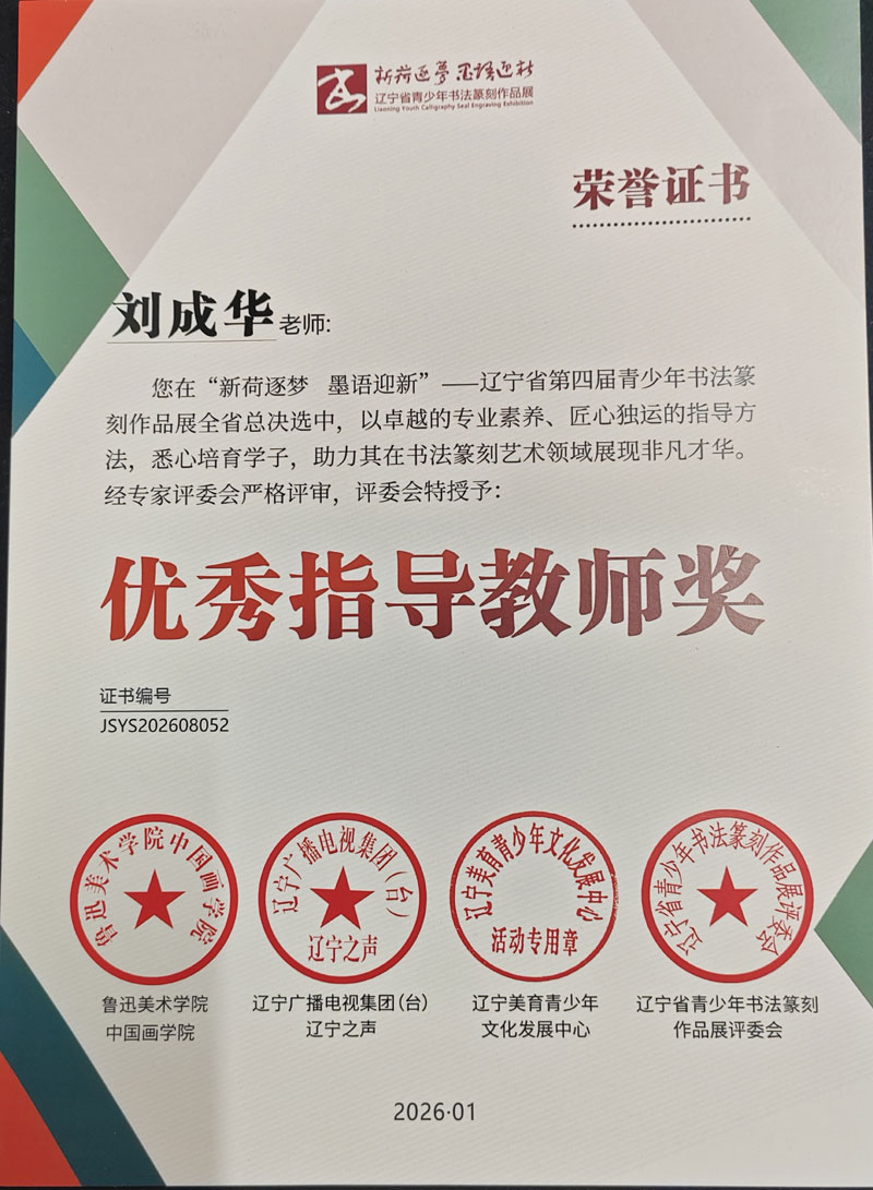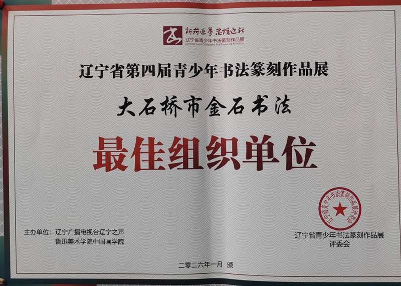大石橋市金石書法培訓(xùn)中心劉晉源書法作品在遼寧省第四屆青少年書法篆刻展中榮獲特金獎。