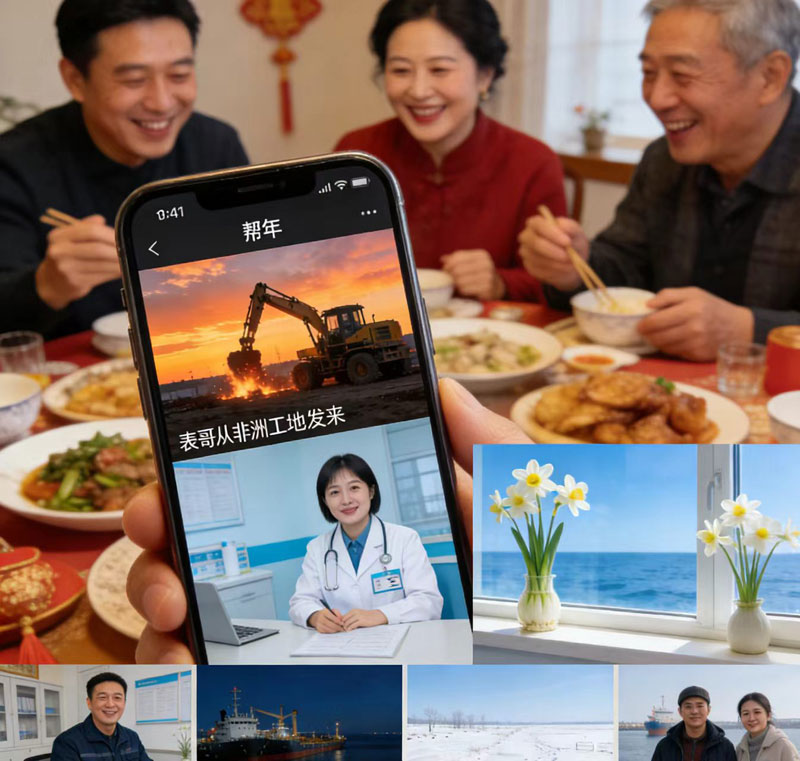點開表侄從非洲工地發(fā)來的視頻,轟鳴的機械聲瞬間壓倒了電視里的歌聲。他身后的天際線,是異國遼遠的晚霞。“姑,姑父,過年好,咱這‘年夜飯’是露天席!”他笑著喊,那被烈日鍍亮的臉龐,比任何春聯(lián)都更鮮亮地訴說著“平安”。