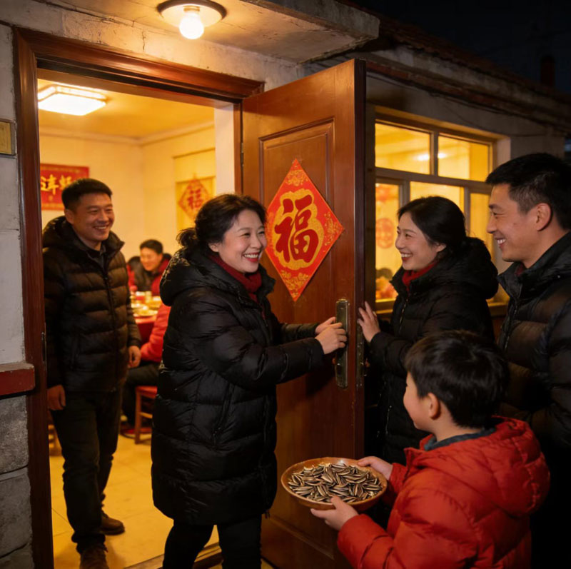 真正的沸點,在入夜之后。天色剛擦黑,拜年的序曲便已奏響。這是營口的老風(fēng)俗——年三十晚上的祝福。一邊看春晚,一邊包餃子。帶著辭舊迎新的急切。我裹著厚羽絨衣,開始看小孩子們放鞭炮,放煙花,呵出的白氣在路燈下暈開光霧。推開一扇扇貼著福字的屋門,迎面便是撲鼻的瓜子香和亮堂堂的歡聲。“過年好!”這樸素滾燙的祝福,在寒夜里碰撞,仿佛要用最直接的人間溫度,驅(qū)散舊年所有的寒氣。從這一刻開始直到正月十五前,無論是敬長輩,祝父母,還是走親訪友都說:過年好。