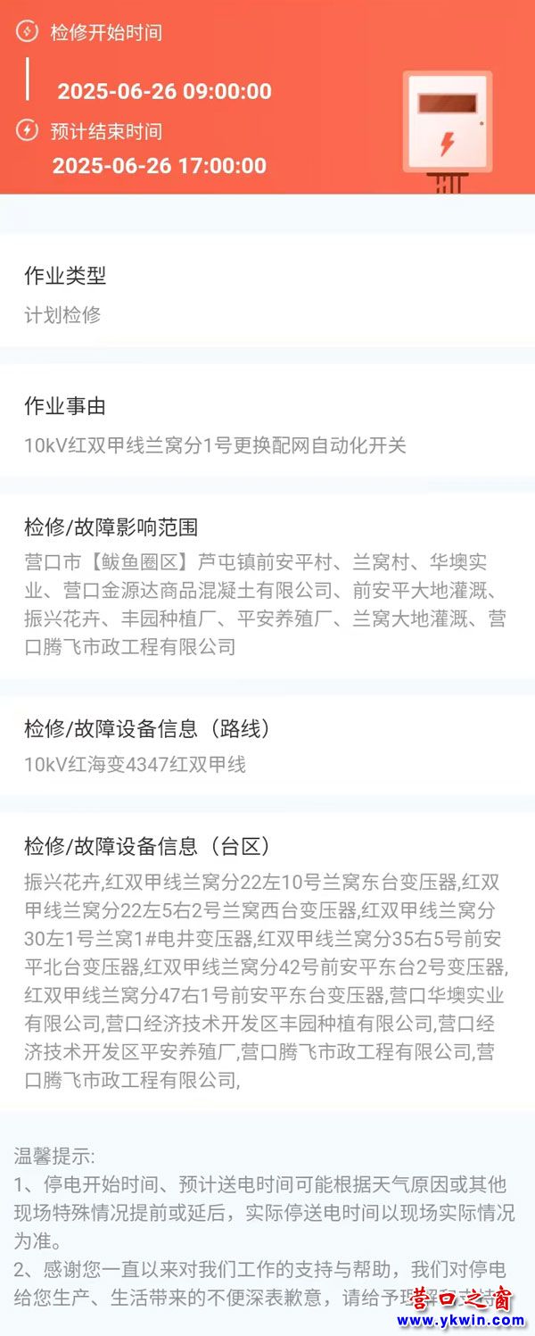 2025年06月26日 鲅魚圈區(qū)電網(wǎng)檢修公告 |