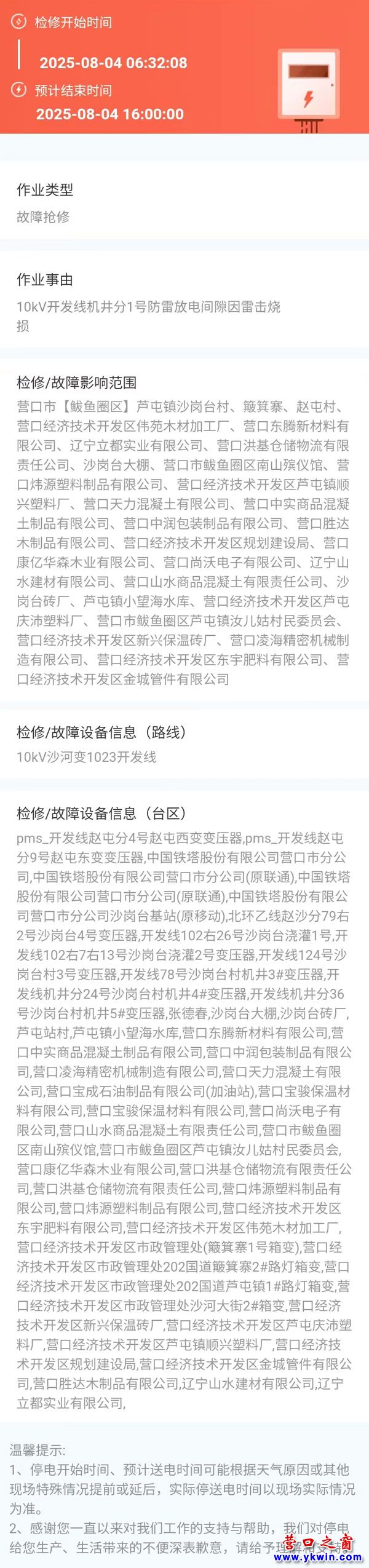 2025年08月04日 鲅魚圈區(qū)電網(wǎng)檢修公告 |