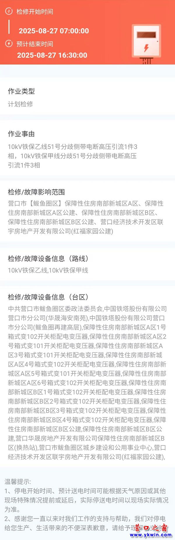 2025年08月27日 鲅魚圈區(qū)電網(wǎng)檢修公告 |