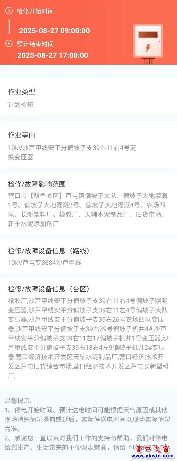 2025年08月27日 鲅魚圈區(qū)電網(wǎng)檢修公告 |
