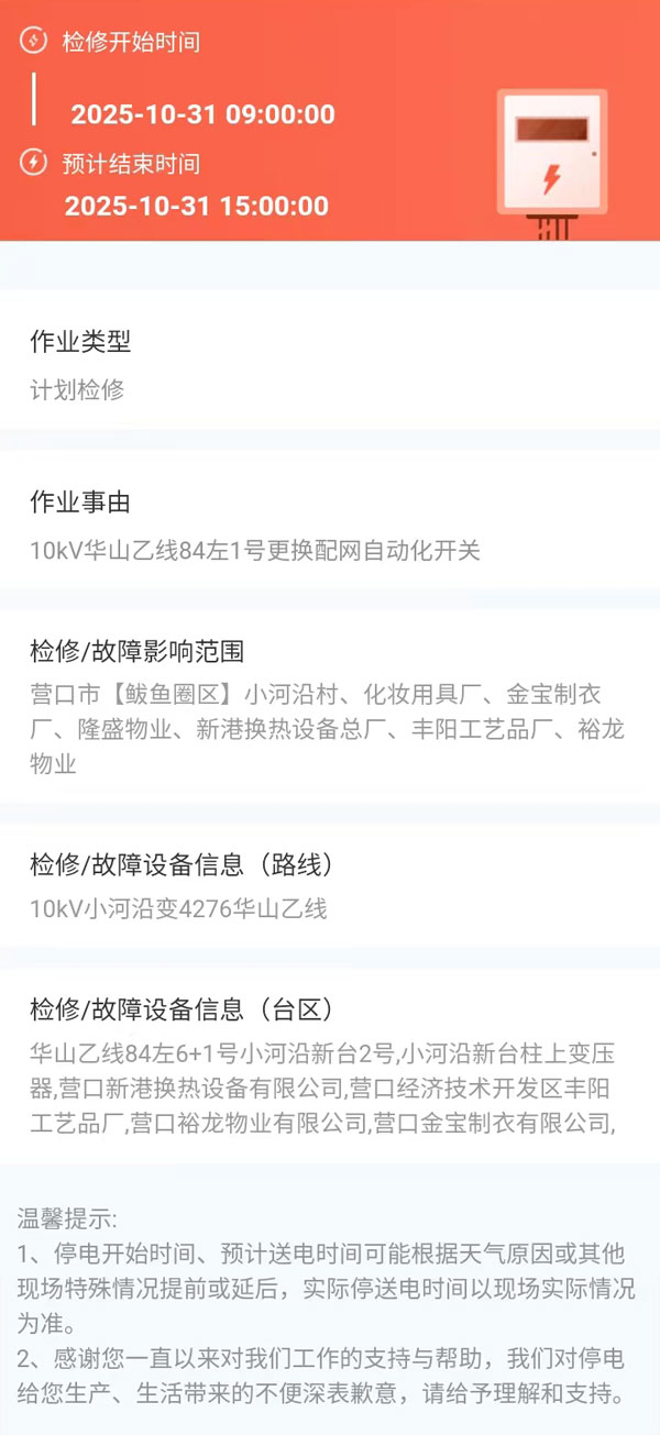 2025年10月31日 鲅魚圈區(qū)電網(wǎng)檢修公告 |