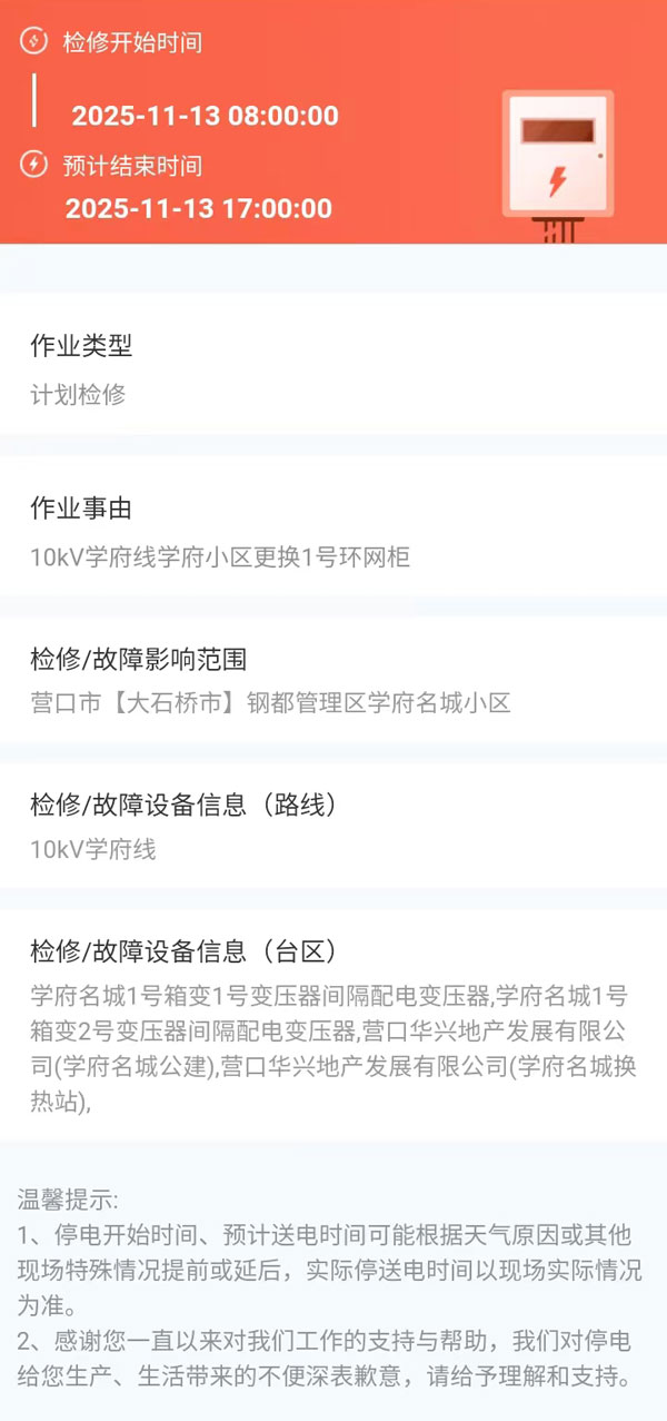 2025年11月13日 大石橋市電網(wǎng)檢修公告 |