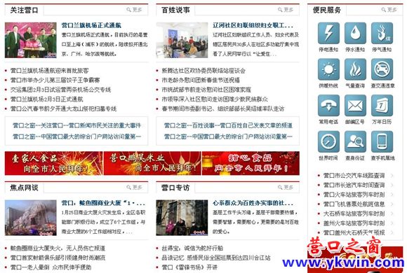 關(guān)注營口、百姓說事、焦點(diǎn)網(wǎng)談、營口專訪四大版塊分開展示,每個版塊最新新聞以圖文形式展現(xiàn)在網(wǎng)友眼前。便民服務(wù)版塊變換位置到網(wǎng)頁右側(cè),讓營口百姓查詢停電、停水、公交等信息更方便。