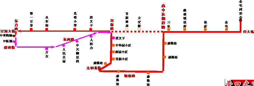 13路調(diào)整走向調(diào)整為“中亞購物”—原線—育新路—太和北街—鍛紡路—原線—“金屯村委會(huì)”,由遼河大街與育新路路口直行調(diào)整為在該路口右轉(zhuǎn)經(jīng)育新路、太和北街、鍛紡路、高中東側(cè)道路至營大路恢復(fù)原線(見附表示意圖)。取消站位:“育新郵局”、“立交橋”。新增“道叉子(11路)”東行、“中華園小區(qū)(11路)”、“南園社區(qū)(11路)”、“育新小區(qū)(11路)”,另在太和北街至營大線路段上新增6處“乘降站”。