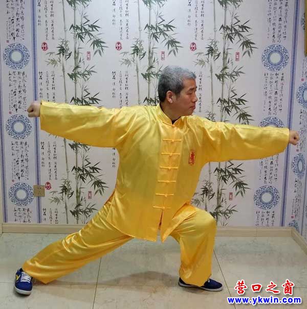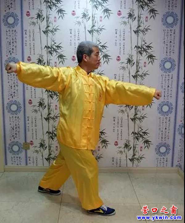 要求兩胯放松,四肢伸開,以順為主。兩臂與兩腿相順,前腿弓,后腿蹬直,大腿平,小腿垂直,前腳豎,后腳橫,成丁字型;上身直立,兩臂平伸,兩拳俯握,掌心向下,兩拳拳面要平,頭側(cè),前手要略低,,后手略高;兩眼盯住對(duì)手,頭端身正,安心定神,擯棄雜念,挺胸收腹,氣沉丹田,腋襠,腳趾抓地。