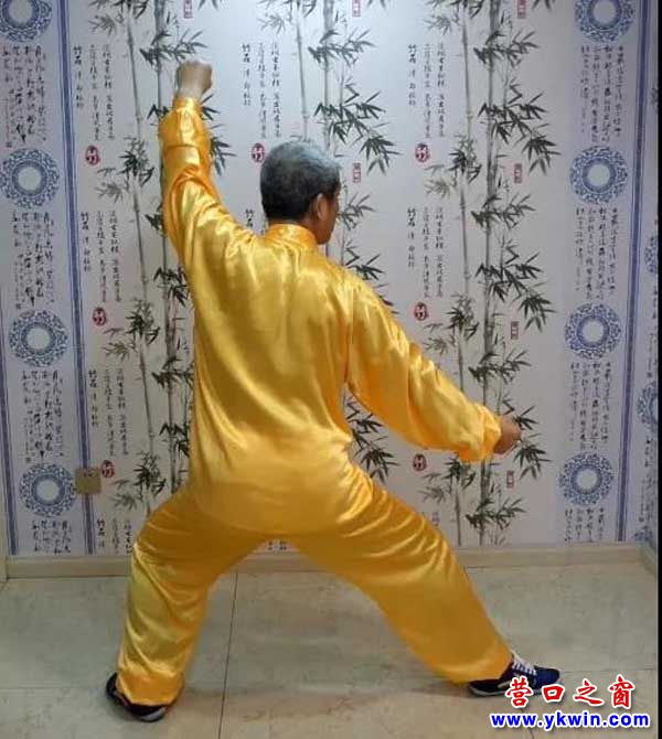 練法:接上式,雙手在體前劃圈后右臂舉起攥拳,左手向左側(cè)伸出,兩胯放松,前腿屈膝蹲步,腳尖戳直,點(diǎn)地面,腳尖與后腳距離我一腳長。后腿屈膝向外,腳站實(shí),乘全身之重量,兩腳成“丁字型”。上身直立,后臂后上揚(yáng),前臂前伸稍彎,兩拳緊握,拳眼相對(duì),如兩手握一大棍。頭與兩拳在同一垂直平面內(nèi)成三尖相照。