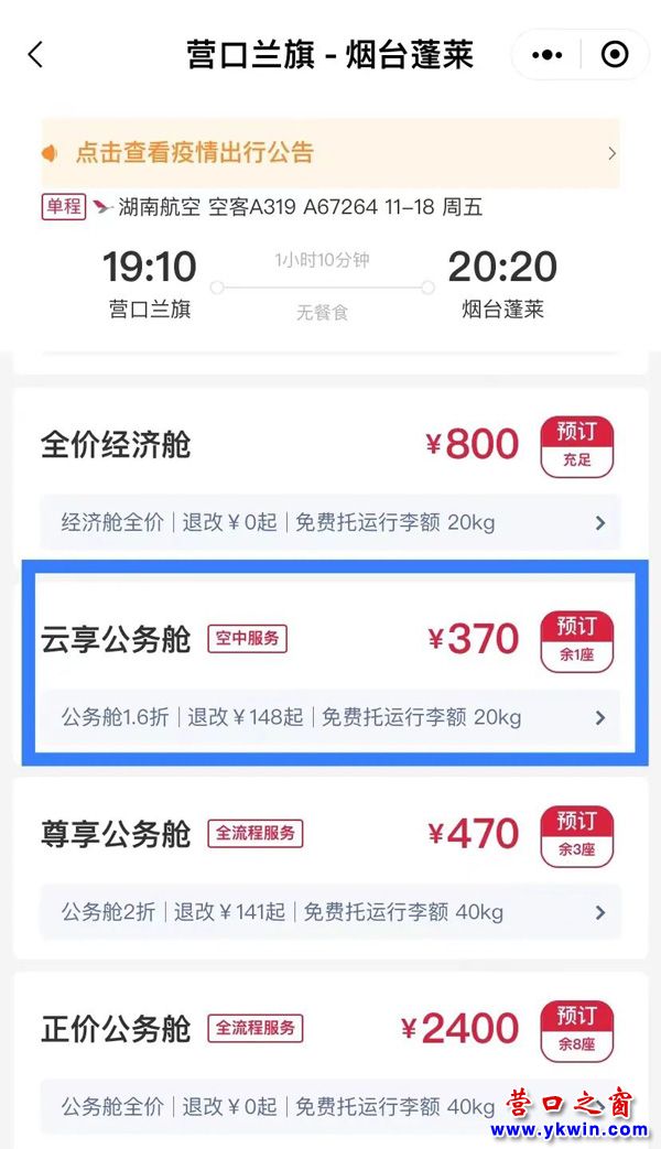 營口-煙臺航班“云享公務(wù)艙”票價不到經(jīng)濟(jì)艙的一半。。。