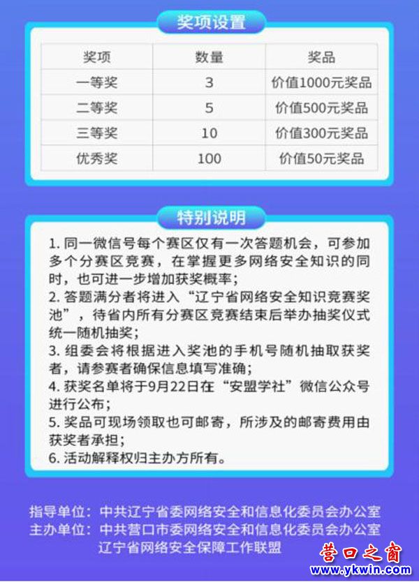2023年遼寧省網(wǎng)絡(luò)安全有獎知識競賽營口賽區(qū)答題通道現(xiàn)已開啟,活動時間截止9月17日,獎項分為一等獎、二等獎、三等獎、優(yōu)秀獎等,獎品豐厚。如何參與?一起看看吧!
