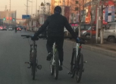 24日17時(shí)左右筆者在新興大街通惠門(mén)市場(chǎng)門(mén)前,發(fā)現(xiàn)一男子騎著一輛自行車,左右手又各自牽著一輛自行車沿著新興大街由西向東騎行,雙手根本沒(méi)有握在自己騎著的自行車上??上攵谒胪\嚂r(shí)車輛根本無(wú)法停住,此行為存在很大的交通安全隱患。