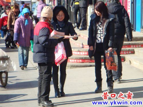 在蓋州市紅旗大街西關(guān)轉(zhuǎn)盤(pán)附近,每天都有幾位中年婦女免費(fèi)給過(guò)路行人發(fā)雜志。由于是免費(fèi)的,很多路人還沒(méi)看清是什么就接過(guò)來(lái)了,有時(shí)散發(fā)者甚至硬往你手里塞,不一會(huì)她們就能發(fā)完一捆。
