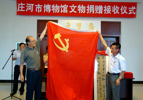 8月1日上午,營口民俗博物館館長曹錫文將營口民俗博物館館藏文物——莊河解放初期的一面中國共產(chǎn)黨黨旗捐贈給莊河市博物館。