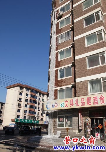 從3月4日開始,站前區(qū)文馨園小區(qū)B5號樓樓頂一直向下淌水,樓下的馬路每天都積水一片。小區(qū)物業(yè)經(jīng)理挨門挨戶詢問,也沒查出誰家的太陽能忘記了關(guān)上上水閥門。3月10日晚降溫,B5號樓外墻排水管周圍凍成了一條30多米高的冰柱,過往的居民都駐足觀看還在淌水的冰溜子,樓下小賣店的男主人擔(dān)心冰溜子掉落到行人,就用鐵鍬將尖狀的冰溜子打掉。