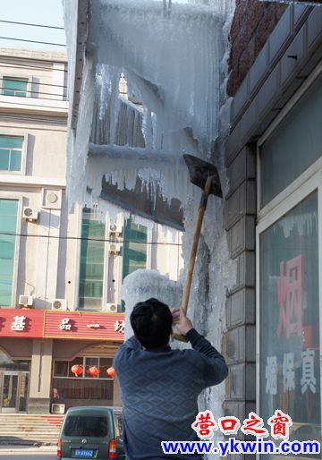 樓下小賣店的男主人用鐵鍬砍掉尖尖的冰溜子