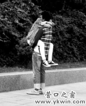 如果說這對(duì)男女的行為不雅的話,另一對(duì)男女的舉動(dòng)就更加大膽。公園航標(biāo)燈處,這對(duì)男女扶著欄桿遠(yuǎn)眺遼河,竊竊私語(yǔ),隨后,令人尷尬的場(chǎng)面忽然就出現(xiàn)了,兩人轉(zhuǎn)身,只見女士雙手搭住男士的肩膀“呼”地一下,竄到男士身上,似乎經(jīng)過訓(xùn)練般的男士迅速拖住女士雙腿,兩人就“合二為一”了。似乎覺得還不夠浪漫,女士要求男士抱著她“走兩步”,于是乎,瘦弱的男士抱著這位“千金”吃力地來回移動(dòng)著,看此情景,游人不僅是要側(cè)目了,還要躲閃著這對(duì)忘我的“二合一體”了。