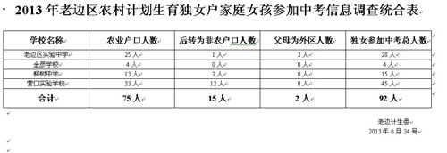 截止到24號(hào)下午三點(diǎn)四十分,2013年?duì)I口市老邊區(qū)計(jì)劃生育獨(dú)女戶家庭女孩參加中考加五分的全部名單已經(jīng)整合完畢。