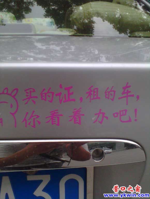 現(xiàn)如今,隨著私家車的普及,越來越多的車主在考慮車輛款式、型號的同時,對車輛尾部的標語也開始追求“個性化”,以往的“請保持車距”等常規(guī)化標語已越來越少。