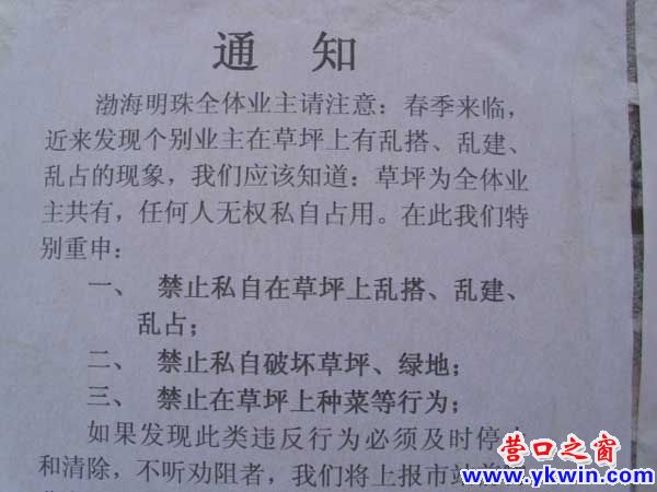 營口渤海明珠小區(qū)張貼通知禁止種菜