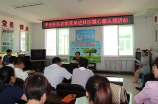 按照區(qū)委統(tǒng)一安排,2014年5月28日下午,西市區(qū)勝利辦事處平安社區(qū)召開《文明微行動、向善微能量》在職黨員進社區(qū)微心愿認(rèn)領(lǐng)活動。