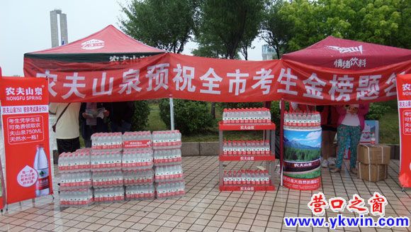 農(nóng)夫山泉、恒大冰泉等,礦泉水公司服務站前,擺放著一箱箱的水,主動分發(fā)給前來避雨的學生家長。雖然外面下著大雨,但是工作人員的積極性仍然高漲,恒大冰泉的兩名員工還沖著鏡頭做鬼臉。在聯(lián)通公司的服務站里,看到一名工作人員正在勸說一位等在雨中的老奶奶:“雨太大了,要不您先進來坐會,考試還有一段時間結束呢,您都淋濕了。”