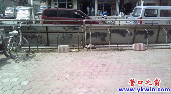 圖為建設(shè)大街上寫滿廣告的停車架擋板后面