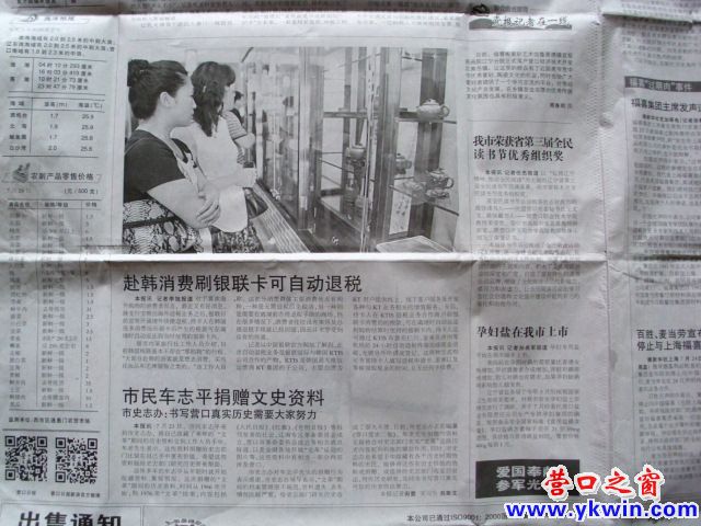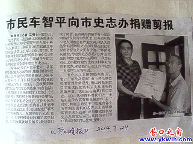 7月24日營(yíng)口晚報(bào)上的《市民車智平向市史志辦捐贈(zèng)剪報(bào)》一文