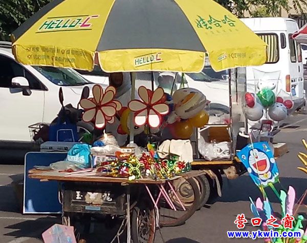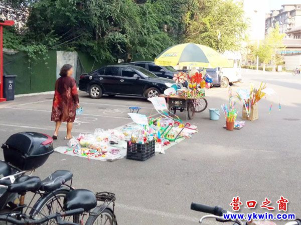 在營口市人民公園東門外廣場,有個(gè)70多歲的老太太擺地?cái)傎u些飲料和兒童玩具之類小商品,一天少則掙幾元錢,多則賺二十幾元錢。