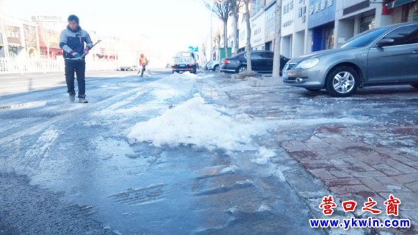 1月7日,行至營口市盼盼路北段米蘭西點(diǎn)營口店門前時(shí),發(fā)現(xiàn)路面出現(xiàn)一條冰河,并有兩名自來水公司的工作人員在除冰。