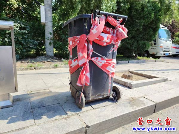 8月1日,經(jīng)過營口市太和北街公交車錦聯(lián)超市站時(shí),發(fā)現(xiàn)一個(gè)滿身開裂纏著紅飄帶的垃圾桶??磥恚呀?jīng)超期服役,應(yīng)該光榮退休了。