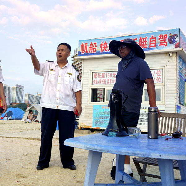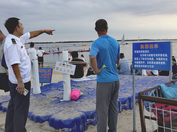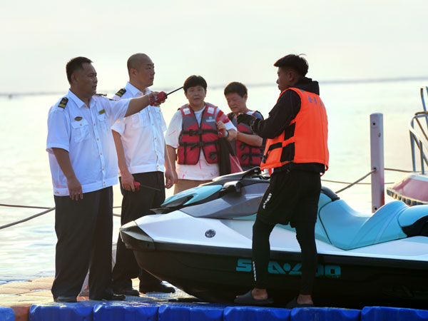 營口海事局的執(zhí)法人員一同走上浮橋,他們身著制服,手持對講機(jī),細(xì)致檢查每一艘出航快艇的安全帶、救生設(shè)備。在碼頭邊,一位工作人員正向游客講解水上安全知識(shí),身旁的“禁止游泳上岸”和“水上救援”警示牌在陽光下格外醒目。