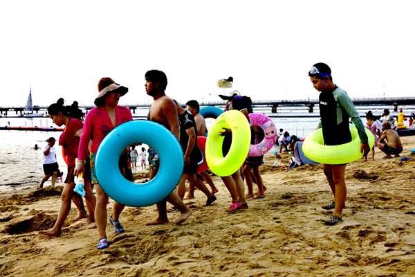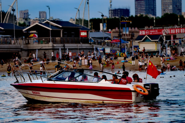 乘上快艇,引擎轟鳴劃破海面,浪花飛濺間,遠(yuǎn)處的夕陽正緩緩沉入海平線,將天空染成金紅??焱系娜藗儞]舞著國旗,歡笑聲與海浪聲交織成一首動(dòng)人的濱海樂章。岸邊的浮橋上,橙衣救生員仍在巡視,他們是我們安心暢游的堅(jiān)實(shí)后盾。