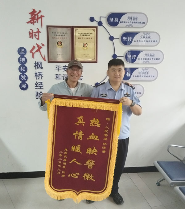 今早我?guī)е\旗,帶著感謝信,帶著全家人的感激,走進(jìn)市公安局,市局的警官熱情的接待我,并迅速,準(zhǔn)確地查出楊警官的工作地點(diǎn):老邊區(qū)公安局營(yíng)東新城派出所!我立即驅(qū)車(chē)前往,送上錦旗與感謝信,并眼含淚花與楊警官合影留念!2025.9.22