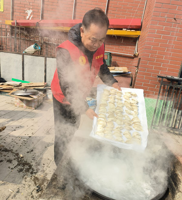 上午9時,志愿者們身著紅馬甲,在社區(qū)工作人員的組織下分工協(xié)作。洗菜、切菜、調(diào)餡、搟皮、包餃子……各個環(huán)節(jié)井然有序?,F(xiàn)場志愿者們齊動手包餃子,不一會兒,案板上便擺滿了形態(tài)各異的餃子,有的圓潤飽滿,有的小巧精致,每一份都承載著對長輩的關(guān)懷。