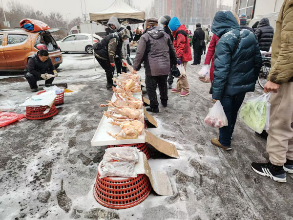 12月13日早晨冒雪逛營(yíng)口市歡心甸露天早市發(fā)現(xiàn)這里有點(diǎn)冷清,因?yàn)樯特溑吕?,青菜怕凍。這時(shí)聽(tīng)到一個(gè)商販對(duì)顧客說(shuō):明天還有最后一天,12月15日這個(gè)早市就沒(méi)了。